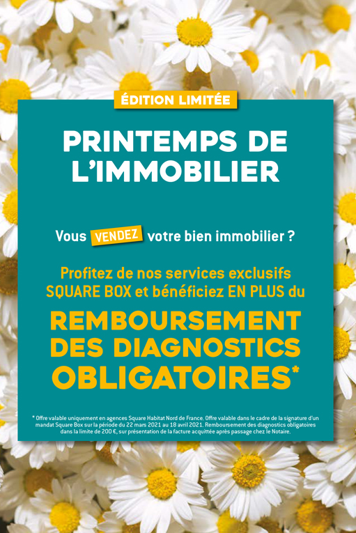 * Offre valable uniquement en agences Square Habitat Nord de France, dans le cadre de la signature d’un mandat Square Box entre le 22 mars 2021 et le 31 mai 2021. Remboursement des diagnostics obligatoires dans la limite de 200 €, sur présentation de la facture acquittée après passage chez le Notaire.