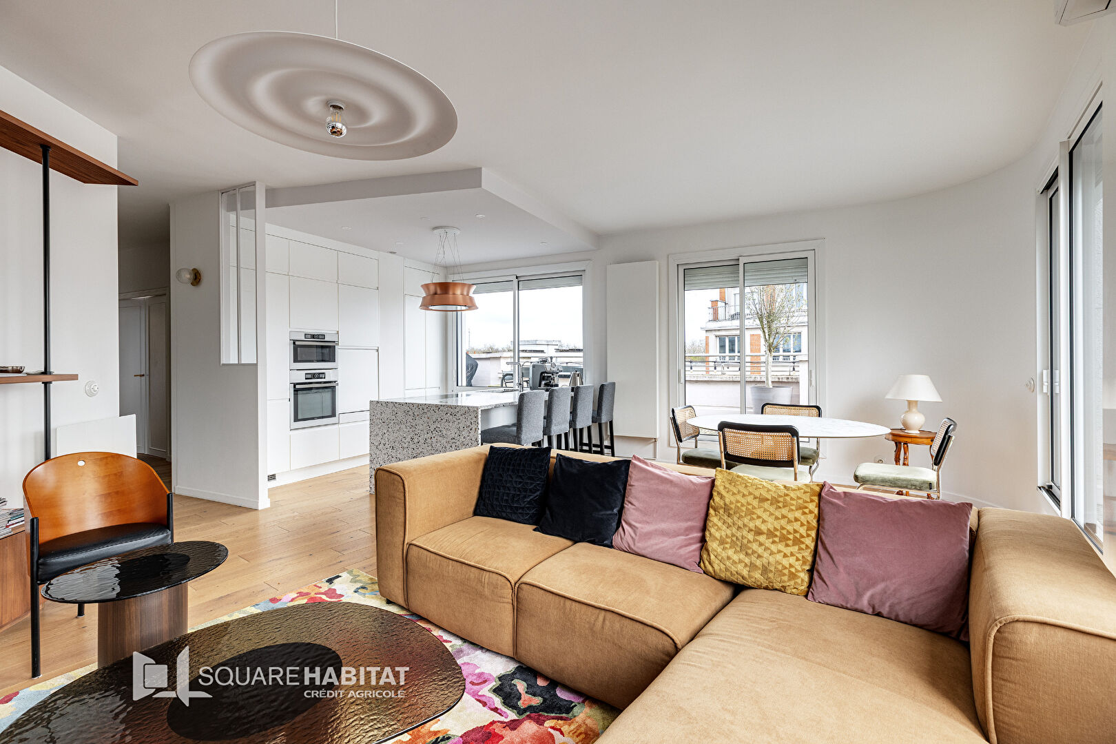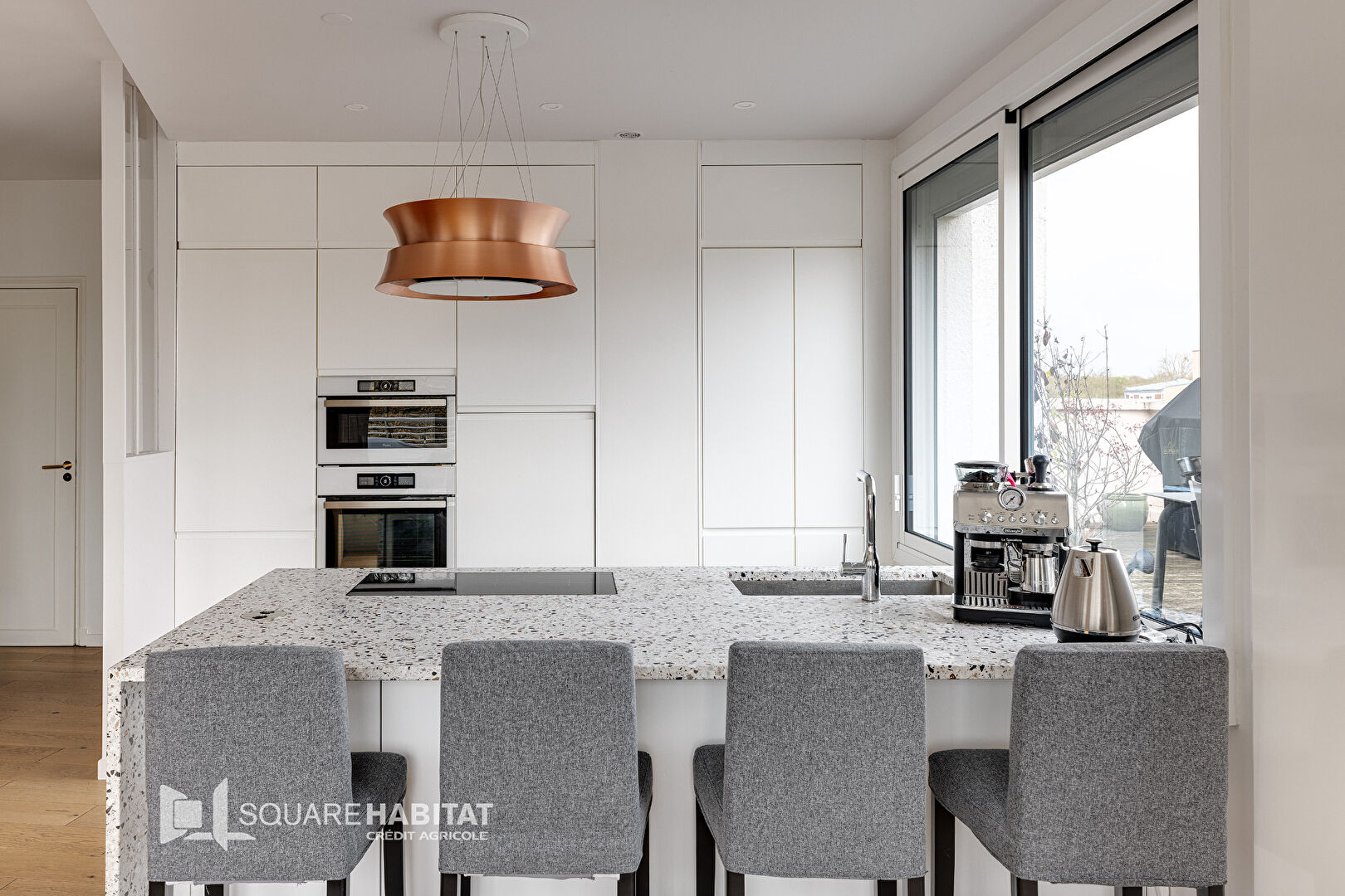 La cuisine ouverte, moderne et entièrement équipée, propose un espace convivial et fonctionnel.