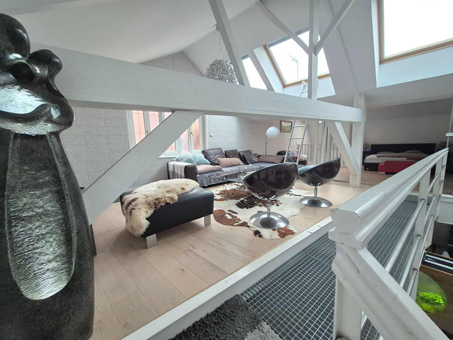A l’étage une grande mezzanine avec le coin salon, 2 espaces chambres ouvert, une salle de bains .