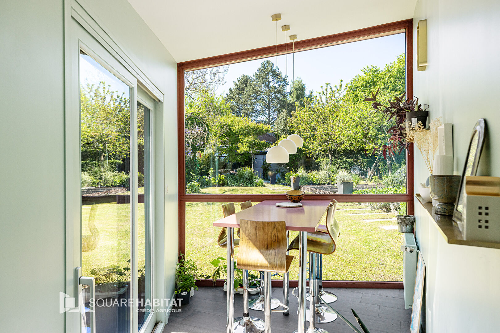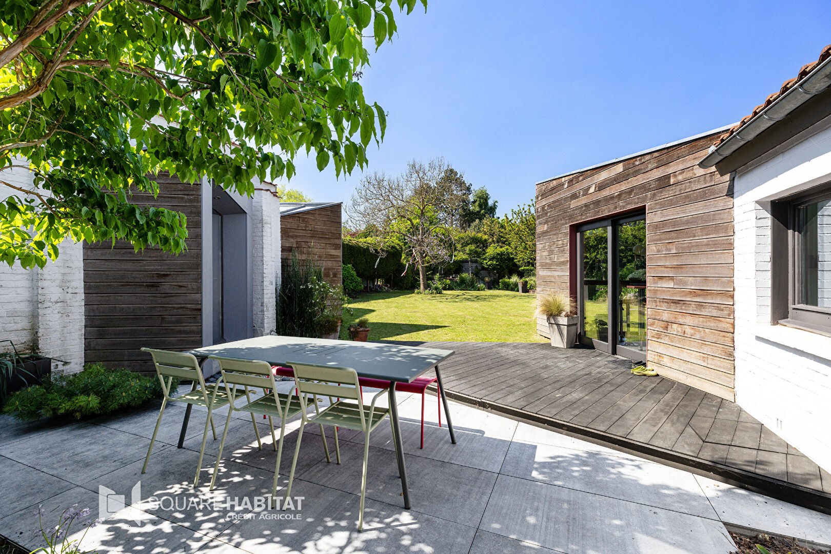 À l’arrière, une extension audacieuse et vitrée comprenant la cuisine moderne et équipée ainsi que son espace repas et son cellier/buanderie, s’ouvre sur une grande terrasse et un vaste jardin paysagé, véritable parenthèse de calme et de nature.
